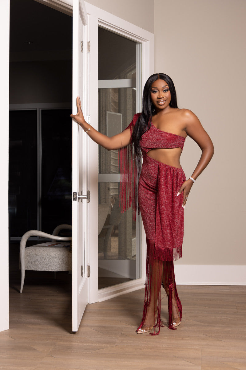 A chic, asymmetrical one-shoulder dress in a rich crimson color, featuring a cutout detail at the waist and long, elegant fringe that drapes from the shoulder and hemline. The shimmering fabric and dramatic fringe give it a glamorous, modern, and red-carpet-ready look.