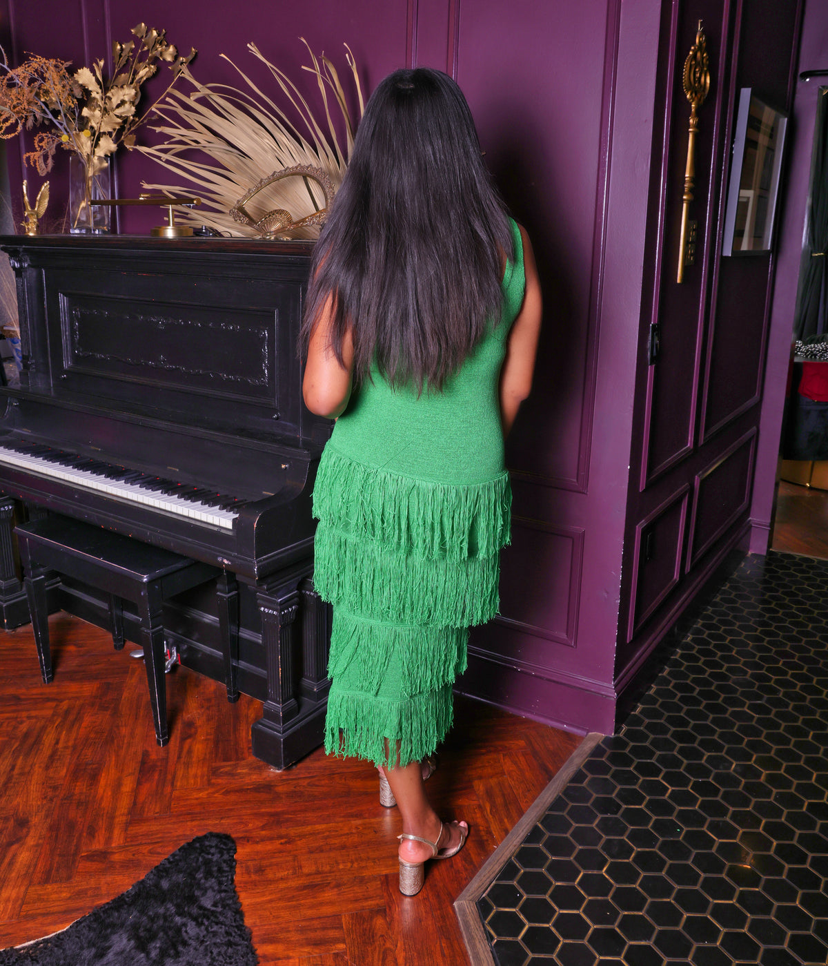 Emerald Green Fringe Knit Midi Dress