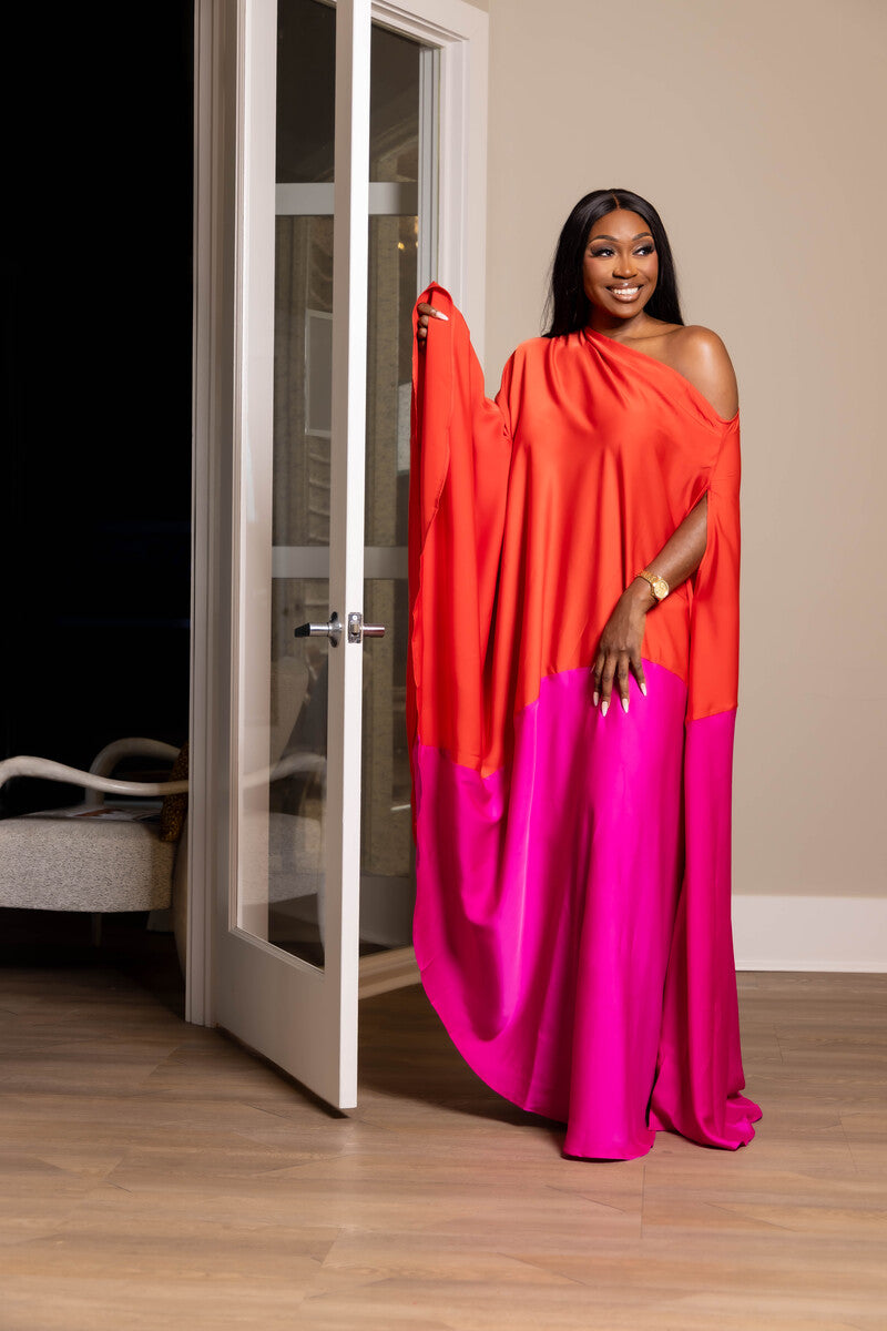 Make a bold and beautiful statement with this stunning one-shoulder maxi dress. Designed with a flowing silhouette that drapes gracefully, this dress blends vibrant red and magenta hues for a sophisticated yet playful look.